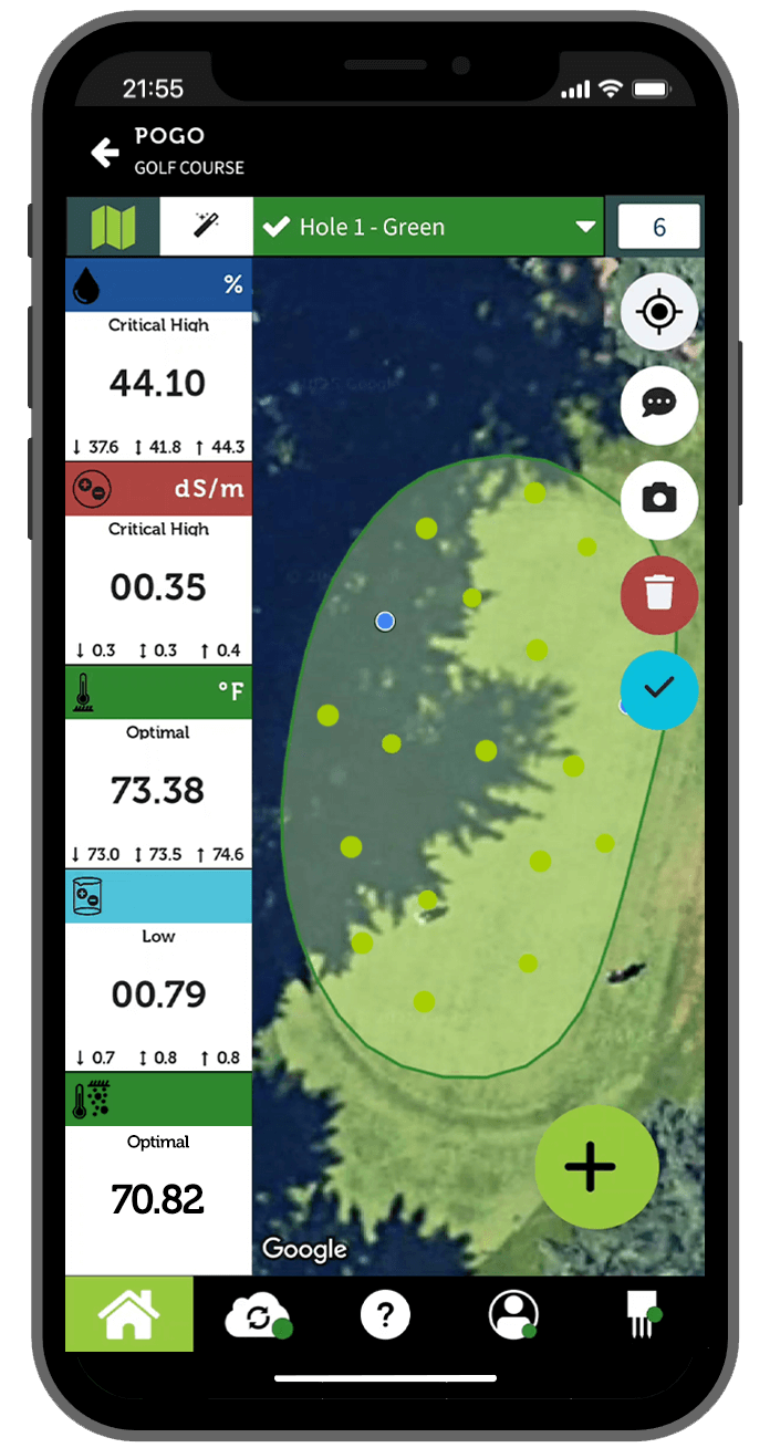 Full satellite mapping functionality that you already know how to use—pinch to zoom, drag to pan, etc. View the current moisture, EC, salinity index and temperature conditions for the entire course, then zoom in to the trouble spots.